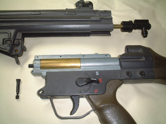 @先ず、アッパーレシーバーを外して、インナーバレルとチャンバーを取り出します。テイクダウンピンを取り外して、アッパーレシーバーを銃口方向にスライドすると外せます。チャンバーからホップダイヤルを取り外します。 | |