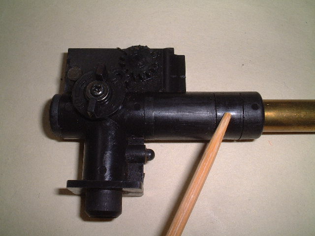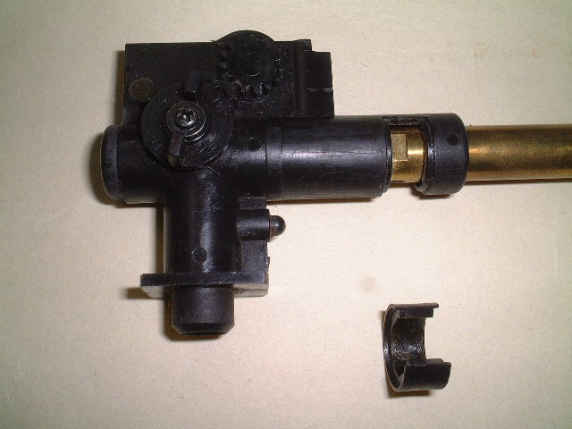 Bホップアップを最弱にした状態で、ストッパーリング(指し示している部品)を外すと、インナーバレルとチャンバーパッキンを引き出す事ができます。チャンバーパッキンが、チャンバー内に残り、インナーバレルのみ引き出された場合、チャンバーパッキンを外す必要性はありませんが、分解して、洗浄することをお勧めします。 | |