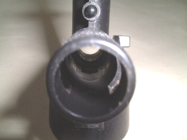 E『参式滑空銃身』をチャンバーの奥までしっかり差し込み、ストッパーリングで固定します。ストッパーリングの方向に注意してください。 ストッパーリングが浮いた感じにならないようにキチンと組み込みます。ホップダイヤルを回したときチャンバーの内側上部の突起が出っ張ってくることを確認してください。このとき、突起が中央にない場合は、組み直してください。 | |