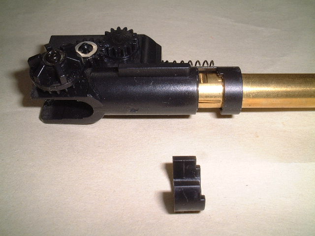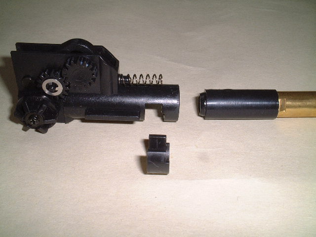 @ホップアップを最弱にした状態で、ストッパーリング(指し示している部品)を外すと、インナーバレルとチャンバーパッキンを引き出す事ができます。チャンバーパッキンが、チャンバー内に残り、インナーバレルのみ引き出された場合、チャンバーパッキンを外す必要性はありませんが、分解して、洗浄することをお勧めします。 | |