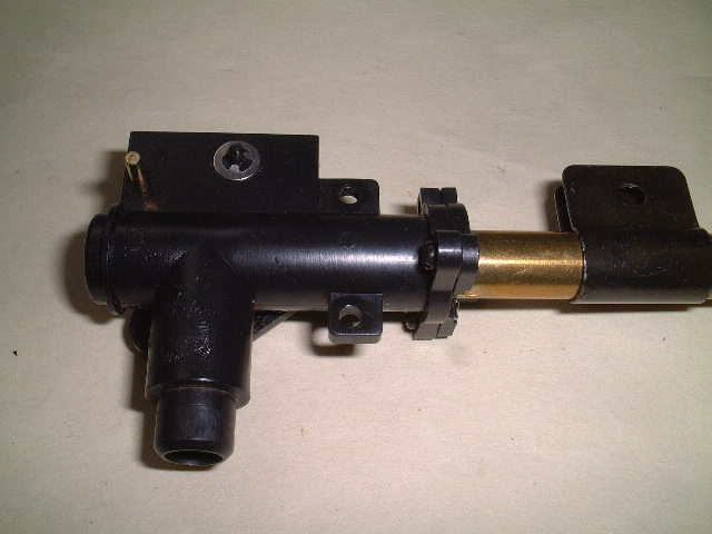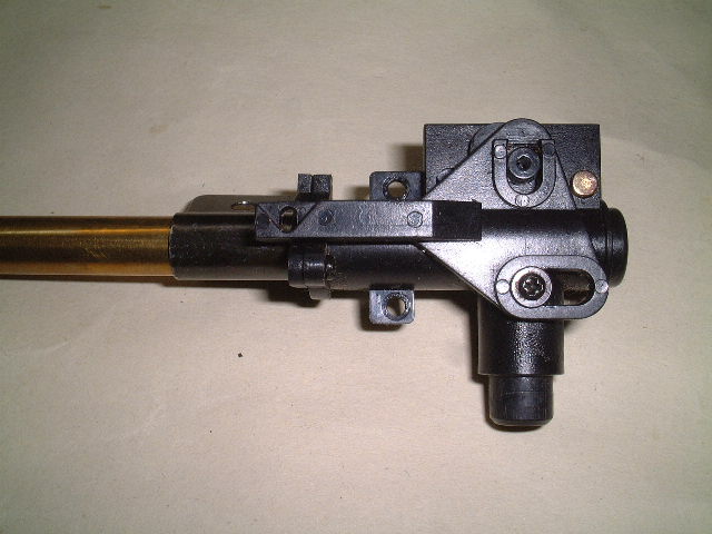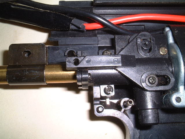 D『参式滑空銃身』をチャンバーの奥までしっかり差し込み、ストッパーリングをネジ止めします。ストッパーリングの方向に注意してください。 ストッパーリングが浮いた感じにならないようにキチンと組み込みます。ホップ調整をしたときチャンバーの内側上部の突起が出っ張ってくることを確認してください。このとき、突起が中央にない場合は、組み直してください。 |