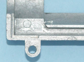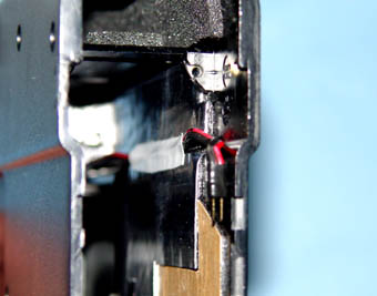 ■メカボックスの干渉部の除去P90では、タペットプレートの直角部の付け根とメカボックスのガイド前端がわずかに干渉しています。通常の使用状況では、問題となりませんが、「サイレントカスタム」を施すと無視できなくなります。そこで今回は、メカボックスのガイド前端の干渉部を削りました。 | |