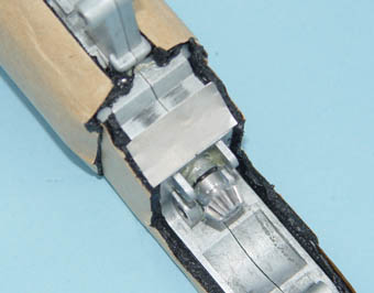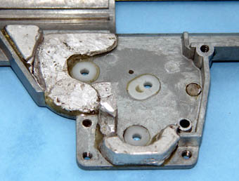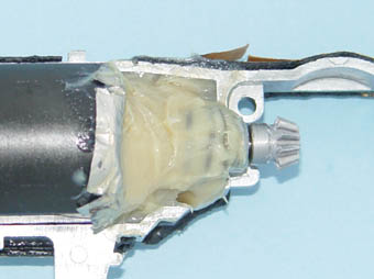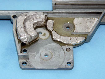 @ハンダで埋めたメカボックスの作例を示す。対応箇所は、ベベルギヤの左側、スパーギヤの右側、セクターギヤの両側及び後部である。1度、パテ等を盛り付けて、干渉を確認し、形状を決定する。石膏で型取りをして、同形状のハンダの部品を作成する。作例では、ハンダ部品をエポキシ系接着剤で接着するとともに、エポキシ系接着剤により隙間を埋めた。接着財硬化後、干渉する部分があれば修正する。 |
