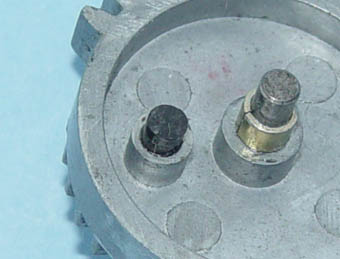 ■タペットプレート後退用ピンの樹脂化停止しているタペットプレートに対して、セクターギヤのピンがかなりのスピードで衝突するため、音が発生します。通常の使用状況では、気になりませんが、「サイレントカスタム」を施すと気になります。そこで、セクターギヤと一体の亜鉛合金製の後退用ピンをより柔らかい素材(合成樹脂)に変えることによって、衝突時に発生する音を軽減します。しかしながら、耐久性は低下すると考えます。 |