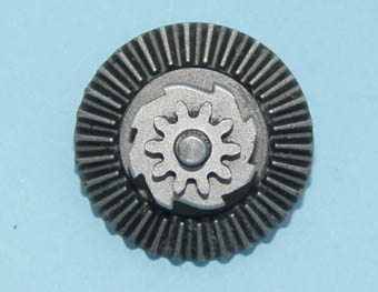ベベルギヤから、軸を抜いた後、逆転防止ラッチ部分をかさ歯車部分からはずす。かさ歯車の歯を保護した上で、両側からマイナスドライバー等を使って、逆転防止ラッチ部分を抜き取る。 |