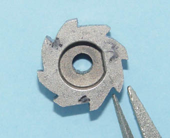 B逆転防止ラッチ部分に8等分の印を付けた後、ラッチ溝を削り出す。材質が比較的硬いので、グラインダーとダイヤモンドヤスリの使用をお勧めする。 |