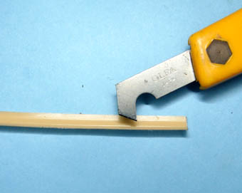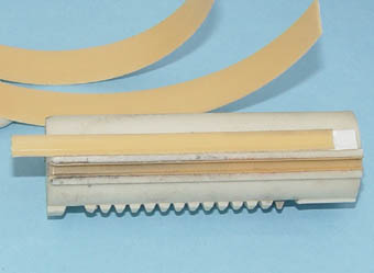 Aメカボックスのレール寸法に合わせて、テープを折るためのV溝を付ける(切り離してしまうと、はがれやすいため)。今回は、Pカッターを使用。 |