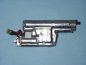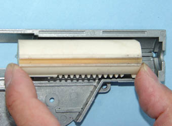 ■逆転防止ラッチの歯数増加「サイレントカスタム」を施すと、指切りによるセミオート、バーストを多用します。射撃弾数が少ないほど、相手に見つかりにくいからです。その際に問題になるのが、ベベルギヤの逆転防止ラッチの作動音です。射撃を止めた時の、ピストンのコッキング状態によっては、勢い良くギヤが逆転し、ラッチで停止する時の衝突音が聞こえます。ベベルギヤの逆転防止ラッチを増加させることにより、ギアの逆転量を少なくして、衝突音を減少させます。また、射撃レスポンスも向上します。ただし、コッキング状態で停止する可能性が高くなるデメリットがあります。 |