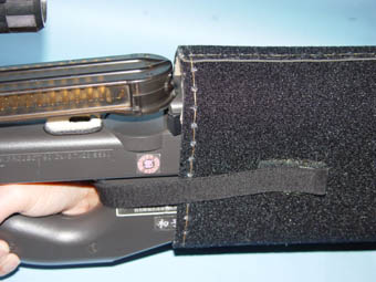 @遮音材(カバー)は、柔軟性があり、使用時の摩擦に強く、そこそこ重量がある素材として、車用フロアマットを使用。ゴムとカーペット地の二層構造になっている。内部の吸音材は、銃の凹凸に添う柔軟性と、差込装着時に滑りが良く型崩れしない素材として、100円ショップで見つけたフリース素材のマフラーを使用。 |