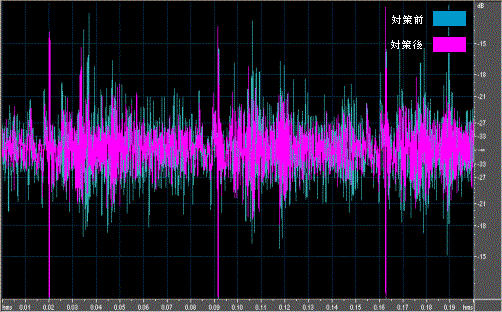 ■ピストンガイドレール部のガタ軽減 動作波形比較(※簡易測定による)対策前と対策後の動作波形。3発分を切り出して重ねて表示している。測定結果、2.4dBの改善効果が得られた。ノーマルと比較して各部のピーク(ピストンがメカボックスのレールに衝突することにより発生する音と考える)が減少している。 | |