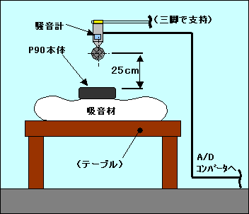 ■メカノイズ測定方法(室内簡易法)測定場所は木造の屋内(6畳)。対策前後の状態を把握する為の簡易的測定方法であり、測定数値はあくまで参考。使用銃はP90TR。弾丸発射状態で測定。弾受は防音対策を施し、着弾音の影響が出来るだけ少なくなるように配慮。測定位置はユニット上面中央。騒音計で取得したA特性フィルタ(耳の周波数特性に補正するフィルタ)補正済みの作動音をパソコンに取り込み、動作音2秒間の騒音レベル算出と周波数特性分析を実施。室内の反射の影響を極力少なくするためと、機材の設置距離の制限から測定対象と騒音計の距離は25cmとした。(使用機器:CUSTOM SL-1370 普通型騒音計、EDIROL UA-5 USB AUDIO INTERFACE(A/Dコンバータ)、ノートパソコンpentiumV750MHz) |