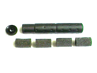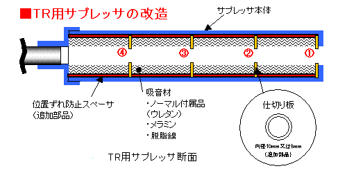 ■TR用サプレッサの改造本改造の主旨は、TR用サプレッサ内部に仕切り板を設け、性能向上を図ること。仕切り板の間に入る位置ずれ防止スペーサは、弾丸発射時に各仕切り板に掛かる圧力を受け止め、仕切り板の位置ずれを防止する。これがないと、圧力が掛かった瞬間、スペーサは前方向に力を受けて吸音材を圧縮、変形させる。この力の掛かり方が不均一になると、弾の通り道を塞ぎ、内部で接触を起こし、吸音構造材を破壊してしまう。最悪の場合、弾詰りによる本体の破損も起こりうるので仕切り板を使用する時は必ず入れる。材質は加工及び入手の容易さを考え、厚紙を選択する。仕切り板は内径10mmと8mmを用意。先端から@〜Cの管理番号を付け、差し替えて性能を確認する。傾向として内径が小さい程、音の点では有利と思われるが、弾との隙間が無くなるので、接触の可能性が高くなる。性能に影響の無い範囲で大きい物を採用したい。吸音材はノーマル付属品のウレタンスポンジ(以下ウレタン)の他、入手が容易で扱いやすく、効果が高いと考えられるものを用意した。 |