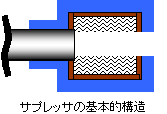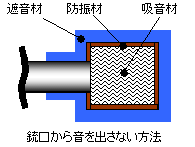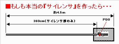 ■もしも『サイレンサ』を作ったら…本当に『サイレンサ』と呼べる性能を出すためには、この位の長さは覚悟しなくてはならないだろう。当然本体の防音対策も必要なので、密閉された箱の中に吸音材と共にエアガン全体を収納する。強いて使うならロケットランチャーのように肩に担ぐことになるだろう。推定全長4.5m! 箱は高い遮音性を得るために相当頑丈にしなければならない。重さ20kgは下らないだろう。キミは物干し竿のような物体を肩に担いでサバイバルゲームができるか!? 実現の困難さを解ってもらえただろうか。…もっとも現実的には正面1mで50dB(環境騒音値)である必要はないので、ここまでしなくても実戦距離で認識困難なレベルの性能は実現可能と考えているが。(サプレッサ有効長180mm、直径35mm、正面1mでの平均音圧レベル約76dBのTR用サプレッサを基にして、直径と内部構造を変えずにこれを50dB以下とするには、単純計算でさらに26dB減少させなければならない。音は距離の2乗に反比例して減衰するから、6dB(音が半分に減少する)毎に2倍の長さが必要。26dBの減少には6dB×4+2dB(2倍×2倍×2倍×2倍×1.26倍)で実に20倍以上の長さが必要となる。) |