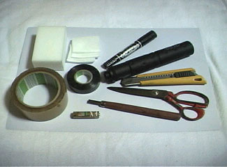 @今回の実験準備に使用するもの。ハサミ、カッター、彫刻刀(丸刀)、ビニールテープ、薄手のテープ、厚紙。吸音材(メラミンスポンジ、脱脂綿)、瞬間接着剤、マジック、乾電池等(紙の癖付け用)どれもホームセンターや100円ショップで揃う。厚紙は、ホームセンターで購入。文房具店にもある。今回使用したものは最も多くの店頭で見かけた430g/m2のもの。紙の厚さは1平方メートル当りの重量で表されている。(寸法398mm×275mm。厚さ実測約0.8mm。)10枚入りで250円前後 |