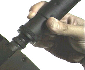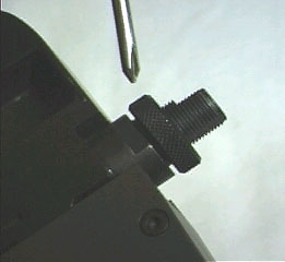 Aサプレッサ取り付けの注意。サプレッサ取り付け基部のWナット(ロックナット)は常に最後まで締め込んだ状態で使用する事をお勧めする。ここのネジはかなりガタがあり、ねじ込み位置が変わると芯がずれ、サプレッサ内部に弾が接触するおそれがある |