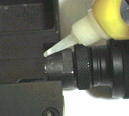 Dサプレッサの曲げたい方向にビニールテープを貼りつけ、引っ張りながら傾けた時の見え方が均等になるよう調整し、レシーバーに貼り付け、固定する。この状態で瞬間接着剤を流し込み、硬化するまで待つ。隙間が大きい場合、完全に硬化し、固定されるまでには3〜4時間程掛かるようだ。この間、定期的にバレルを覗きながら傾きが発生していないか確認しよう。固まってしまうと矯正が利かないので慎重に作業しよう。出来れば、硬化促進剤が付属した瞬間接着剤を購入しておくと、作業が早く済む |