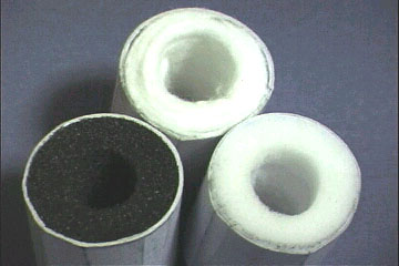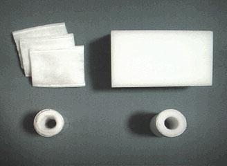 吸音材の性能比較ウレタン、吸音特性に癖がなく音響用によく使われる綿が素材の脱脂綿、気泡が緻密で吸音特性が良さそうなメラミンスポンジ(”水だけで汚れが落ちるスポンジ”等の能書きで、日用品コーナーにある)を試してみた。詰め込み状態は実用時の形状の安定性を考慮し、極力圧縮変形させないよう、素材の自然状態に近くなるように製作した。結果はノーマルのウレタンが最も良い結果となり、メーカの素材選定の優秀さを裏付ける結果となった。但しスペーサの有無による1.1dBの変化を考慮すると、他の素材についても密度を変えることにより、更なる性能向上の可能性がある。又、ノーマルのウレタンの圧縮時内径約12mmに対し、他の吸音材は自然状態に近い約14mmになっていることも結果に影響していると考える。吸音材や構造については引き続き研究していくが、現に脱脂綿を使用したオリジナル試作品はTR用サプレッサよりも全長が短いにも関わらず、70dB以下を記録している。製作の困難さと安定性がクリアできたら、ご紹介しようと考えている。※各吸音材の内径は同一ではない。 左から、ウレタン、脱脂綿、メラミン |