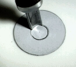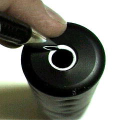 J仕切り板は、コンパス等で直径29mmの円を書き、正確に切り抜く。サプレッサ内部でがたつくと、弾と接触してしまう 内径(弾の通り道)はコンパスの円の上から、丸刀の彫刻刀 を円形になるように何回か押し当てると切れる。いびつな部分は出来るだけきれいな円形になるように、整形しておく 一番先端のスペーサは一部見えてしまうので、気になるならマジック等で黒く塗装しておく |