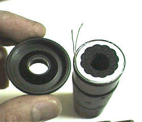 Kスペーサに吸音材を入れる。一度細長く折りたたんで差し込むと入れやすい。入れた後は均等な円形になるよう整形する。一番先端に入るスペーサには、丈夫な太目の糸を通しておくと、入れ直し等の抜き取りがしやすい |