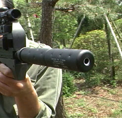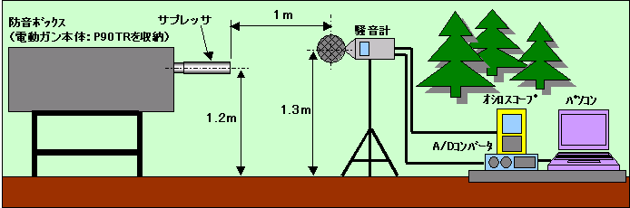 ■サプレッサ性能測定方法測定場所は林の未舗装道路。サプレッサの音を出来るだけ正確に測定する為に、本体全体を密閉し発生する音を遮断する防音ボックスを製作し、サプレッサより発生する音のみを測定している。使用銃はP90TR。騒音計で取得したA特性フィルタ(耳の周波数特性に補正するフィルタ)補正済みの作動音をパソコンに取り込み、フルオート2秒間の騒音レベル算出と周波数特性分析を実施。同時にオシロスコープの状態監視機能で環境騒音レベルが測定条件を満たすこと(測定レベルと環境騒音レベルの差が20dB以上あること)を随時監視している。防音ボックスの防音性能は約20dBあり、JIS記載の測定対象に影響を及ぼさない音圧レベル差10dBを十分満たしている。測定対象と測定器の位置関係はJIS Z 8731:1999(環境騒音の表示・測定方法)に準拠している。(使用機器:CUSTOM SL-1370 普通型騒音計、FLUKE 123 Industrial ScopeMeter、EDIROL UA-5 USB AUDIO INTERFACE、ノートパソコンpentiumV750MHz) |