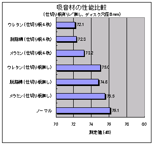 仕切り板10mmの組み合わせ比較仕切り板10mmの場合、最も性能が良かった組み合わせと、仕切り板無しとの差は、1dBである。仕切り板が多いほど、性能が良くなる傾向は出ていると考えるが、本体の作動状態の変化(温度、潤滑状態の変動、環境気圧変化等)、吸音材詰め込み時の状態のばらつき等を考えると、0.5〜1dB程度の誤差は生じると考えられる為、明確な効果とは言いがたい。尚、ノーマルとウレタン(ノーマル付属品)をスペーサに挿入した状態では1.1dBの違いがある。これは時間をおいて複数回計ってもほぼ同様の結果が得られた。吸音材はすぺてスペーサ内に挿入して測定したが、ウレタンについてはノーマルを若干圧縮することになる。これによりウレタンの密度が上がることと、穴の内径が小さくなることが原因と考える。 |