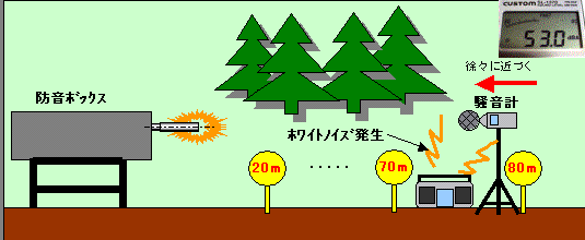 ■フィールド実験方法場所は林の未舗装道路。今回はサプレッサ測定のため、電動ガン側は防音ボックスに固定とし、騒音計側を動かす測定方法をとった。設置場所のサプレッサ先端から10m毎の等間隔に距離を表す目印を設置。今回は20〜80mを用意。合図によって電動ガンを撃ってもらい、徐々に近づきつつ、環境騒音が基準値近辺(±1dB)の時に、騒音計のバーグラフメーターで発射音が確認できた時の距離を計測する。この測定では、一定の環境騒音の基でデータを取得することが不可欠であるが、自然界では鳥の鳴き声や風の状態等常に変動している。このため、前回の測定では測定タイミングを取ることが困難でデータの信憑性にも疑問があった。そこで今回は近傍でホワイトノイズ(擬似環境騒音)を発生させ、環境騒音を一定とし、表示の安定化を図った。環境騒音値は環境基本法におけるAA地域(療養施設、社会福祉施設等が集合して設置される地域など特に静穏を要する地域)の昼間の基準値である、50dBとした。今後は特に障害が無い場合はこれを基準とする。尚、今回は前回の『電動ユニット周りの吸音対策』で行った53dBにおけるデータも取得した。(使用機器:CUSTOM SL-1370 普通型騒音計) |