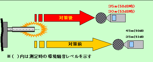■フィールド実験結果(騒音計が感知する距離の比較)環境騒音50dB時: ノーマルでは45m離れて発射音が感知出来たのに対し、対策後は35mまで近づかないと、感知出来なかった。(約2割の距離短縮)今回は前回の時より、風も穏やかで比較的静かな日であったので、聴感では発射音は確認できた。ただし自分よりはるかに後方への着弾音のほうが大きいくらいだ。音色はノーマルよりも低く聞き取りづらい印象を受ける。 環境騒音53dB時:ノーマルでは35m離れて発射音が感知出来たのに対し、対策後は30mまで近づかないと、感知できなかった。環境騒音レベルが3dB上がっているので、当然より近づかないと感知できない。聴感ではノイズ音が耳障りで50dB時よりも更に聞き取りにくい。実戦においてこの発射音で回避行動を取ろうという気は起こらない。かなり遠くで発射音がするといった印象でこの程度でいちいち反応していたらゲームにならないといったレベルだ。 |