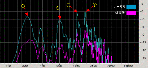 ■周波数特性測定結果対策後はノーマルと比較し、全体的に音が小さくなっている。特に大きく変化しているのは突出している周波数成分(@〜C)のレベルで、約7〜9dB小さくなっている。突出した周波数成分とその他の部分のレベル差が大きい程、突出した周波数成分が、聞こえる音に強く影響してくる。これが特徴的な発射音「例:ポポポポポ・・・」といったものを形成している。ノーマルは約2000Hz前後の最も耳障りな周波数成分(B、C)のレベルが最も高いため、聞こえやすい。対策後は、音の特徴には大差ないものの他の周波数成分との差が小さくなっており、より耳障りで無い音に変化している。(設定:FFTサイズ:2048、窓関数:Hanning)ピーク周波数880Hz(全周波数の中で最も大きな音圧レベル)より-20dB(10分の1)以下は無視できるため、切り捨ててある。 |