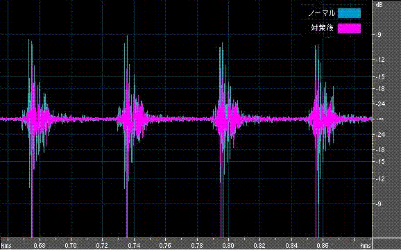 ■動作波形比較対策前と対策後の動作波形。フルオートで2秒間撃ったものから一部(4発分)を切り出して重ねて表示。対策後の音が全体的に小さくなっているのがわかるだろう。防音ボックスにより、本体作動音は殆ど含まれていないので、前回データと比較すると銃口から出る音(サプレッサ音)のみが明確に分かる。音圧レベル測定結果