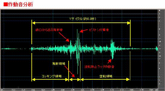 ■作動音分析P90のセミオート作動状態を波形で示したもの。音圧レベルが高いほど波形の振れが大きくなる。音の波形を取得することでその動作がある程度推測できる。この結果から何を対策すべきかを決め、その効果も、より明確に把握できる。(使用銃:P90TR。TR用サプレッサ付き。測定方法及び位置は『メカノイズ測定方法』に準拠。) |