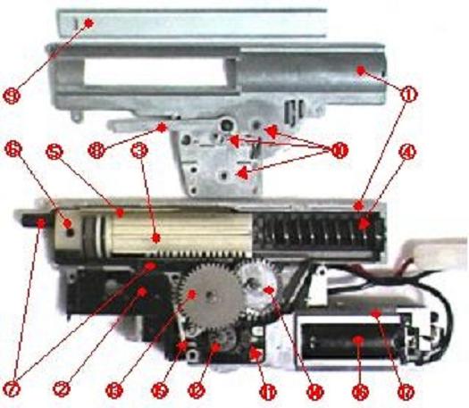 ■P90用メカボックス(Ver.6)の構造@メカボックス:ピストン、シリンダやギヤ等を保持、ガイドする |