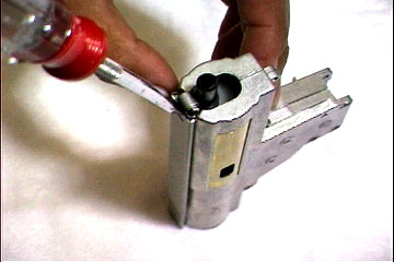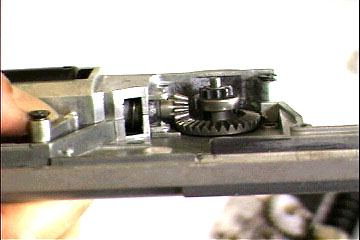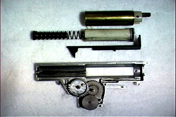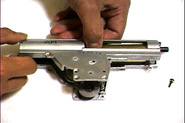 C特殊ネジ1本を外し、スプリングガイドが飛び出さないようにシリンダ部を押えながら、メカボックスを開けます。開けるときメカボックス左側にギヤが残るように、ギヤ軸を押すと良いでしょう。ピストンが、途中までコッキングされている場合は、逆転防止ラッチを解除しておきましょう |