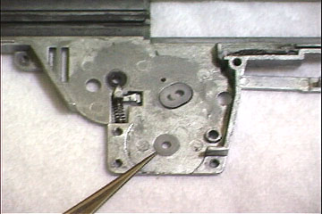 Iセクターギヤ右側にギヤ用ワッシャを追加した状態でメカボックス右側に仮組みして、セクターギヤとタペットプレート、セクターギヤのピンとメカボックスのリブの干渉を確認します。干渉する場合は、ギヤ用ワッシャの厚みの割り振りを変更し再確認します | ![]() |