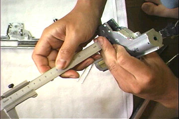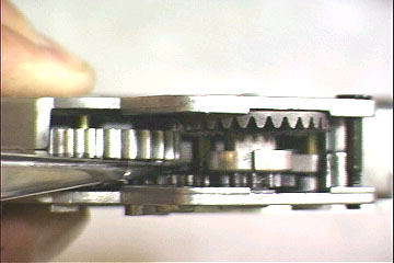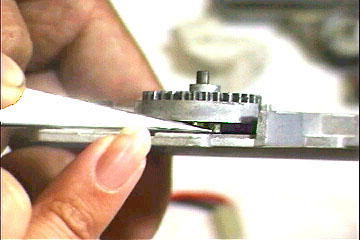 F仮組みしてギヤ軸のガタを測定します。ギヤ軸を押し込んだときと、反対側から押し込んだときの差をノギスで測定します。軸受け本体からギヤ軸がはみ出すことが多いので、0.5mmのギヤ用ワッシャをはさんだ状態で測定するといいでしょう | ![]() |