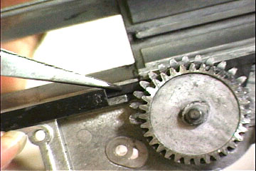 Hギヤ軸ガタの測定値を基にギヤ用ワッシャ(シム)を追加します。新品状態においてギヤ用ワッシャは各1枚入れられており標準値は以下の通りです。 [ベベルギヤ右側0.15mm、左側0.3mm、スパーギヤ右側0.5mm、左側0.3mm、セクターギヤ右側0.15mm、左側0.3mm] ベベルギヤとピニオンギヤのかみ合いに問題がなければ、ギヤ軸ガタの測定値分(または、少し少なめ)のギヤ用ワッシャ(シム)をベベルギヤ左側(小歯車側)に追加します。外径の異なるギヤ用ワッシャを重ねて使用する場合は、軸受けの側面の傷みを促進しないため、軸受け側に径の大きなものを使用します。 次に、スパーギヤにギヤ用ワッシャを追加します。ベベルギヤ小歯車の歯幅内に、スパーギヤ大歯車が収まるようにスパーギヤ左側(大歯車側)にギヤ用ワッシャを追加します。ここで逆転防止ラッチスプリングがスパーギヤ大歯車側面に干渉、もしくは、隙間が小さい場合は、ギヤ用ワッシャを薄くする必要があります。スパーギヤ右側に不足分のギヤ用ワッシャを追加します。ギヤ用ワッシャを重ねて使用する場合は、軸側に穴径の小さいものを使用したほうが良いでしょう。 続いて、スパーギヤとセクターギヤのかみ合いをセクターギヤ左側にギヤ用ワッシャを追加することで調整します。あまり歯幅方向の隙間が小さいと側面が擦れるので、可能であれば0.2mm近い隙間を確保したいところです。セクターギヤ右側に不足分のギヤ用ワッシャを追加します |
