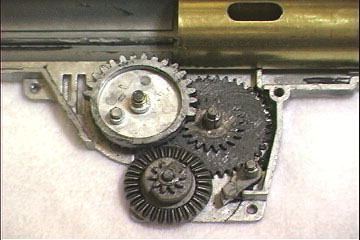 K潤滑油については、歯面は、基本的に『そのまま』(新品状態と同等)とし、軸受け面、ギヤ軸、ギヤ用ワッシャ側面は、東京マルイ製高粘度特殊グリスを塗布しました。これは、歯面は、ある程度磨耗が進行してほしいけれども、軸受けは、磨耗してほしくないという理由からです |