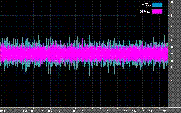 ■動作波形比較なじみ運転前となじみ運転後の動作波形。2秒間を切り出して重ねて表示している。対策後の音が全体的に小さくなっているのがわかるだろう。ギヤ単体の減音対策方法として、なじみ運転は有効な手法であることが分かる。(なじみ運転時間:電圧8V(P90の動作時状態に近似)で2時間。平均電流3A。ノーマルラージバッテリーで約5本分に相当)音圧レベル測定結果
