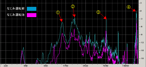 ■周波数特性測定結果約20,000Hzの非常に鋭いピーク(C)を最大に、他の主なピークも1000Hz以上になっている。基本的に突出している周波数成分(@〜C)が聞こえる音に強く影響することから、ギヤノイズは耳障りな高音であることが分かる。ギヤノイズの発生原因の一つに歯面粗さや歯形の不均一による、歯当りの悪さがあるが、なじみ運転を行うことでほとんどの周波数で約3〜4dB小さくなった。歯当りの改善は、広い周波数の音に対して効果があると言えるだろう。(設定:FFTサイズ:2048、窓関数:Hanning)ピーク周波数880Hz(全周波数の中で最も大きな音圧レベル)より-20dB(10分の1)以下は無視できる為、切り捨ててある。 |