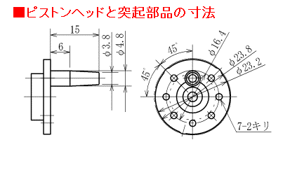 Dピストンヘッドに、穴あけ作業をします。段差ぎりぎりになるように配置するので、外周から約3.4mmの位置になります。穴のシリンダーヘッド側は、面取りしておきます。直径の大きいドリルを使うのが良いでしょう。シリンダーヘッドの緩衝材との当たりがありますので、あまり大きくしないほうが良いでしょう。段差側も、面取りしたいところですが、直径の大きいドリルは使えませんので、クラフトナイフで、バリだけは、取っておきましょう。穴の位置自体は、多少ずれても、問題ありませんが、あまりズレが大きいと、前回追加工したシリンダーヘッドの緩衝材の頂点と重なってしまうので注意が必要です。 |