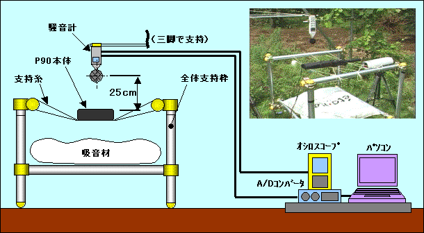 ■メカノイズ測定方法測定場所は土の地面で周囲に音を反射する有害障害物の無い場所を選定。測定対象の音を出来るだけ正確に測定する為に、反射、共振の影響が少なくなるよう、フローティングさせて測定している。使用銃はP90TR。弾丸発射状態で測定。弾受けは十分距離を取り、着弾音の影響が無い様に配慮。測定位置はユニット上面中央。騒音計で取得したA特性フィルタ(耳の周波数特性に補正するフィルタ)補正済みの作動音をパソコンに取り込み、動作音2秒間の騒音レベル算出と周波数特性分析を実施。同時にオシロスコープの状態監視機能で環境騒音レベルが測定条件を満たすこと(測定レベルと環境騒音レベルの差が20dB以上あること)を随時監視している。今回はメカノイズを測定することを主な目的としており、また環境騒音の影響を極力少なくする為と機材の設置距離の制限から測定対象と騒音計の距離は25cmとした。(使用機器:CUSTOM SL-1370 普通型騒音計、FLUKE 123 Industrial ScopeMeter、EDIROL UA-5 USB AUDIO INTERFACE、ノートパソコンpentiumV750MHz) |