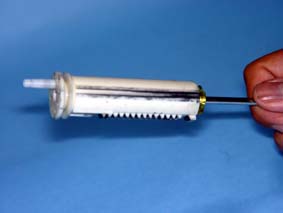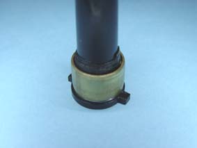 Fピストンヘッドを加工したら、シリンダーパイプに対して、適切な大きさであることを確認します。ピストンヘッドをシリンダーパイプの前進位置に挿入して、ガタツキを確認します。シリンダーパイプは、少しゆがんでいる場合がありますので、組み立てた状態の向きを考えて確認します。ピストンヘッドをピストンに仮止めすると作業が楽です。 |