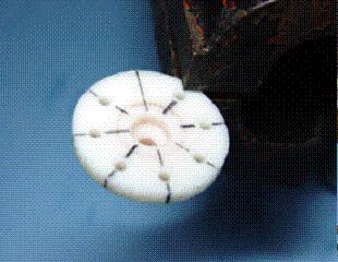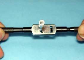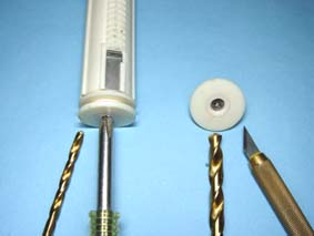 Kパイプを塞ぐための突起部品を作ります。まず、VHSビデオテープの合成樹脂製ローラに、ネジ立て作業を行います。実用上十分な下穴が開いているので、タップ作業だけとなります。シリコンオイル等をつけて作業しましょう。また、タップが傾いて入りやすいので、確認しながら慎重に加工しましょう。材質が、比較的硬いので、素手では足りず、ペンチで挟んで回すことになると思いますが、この時、削り落とせないような深い傷をつけないように注意しましょう。 | ![]() |