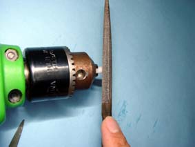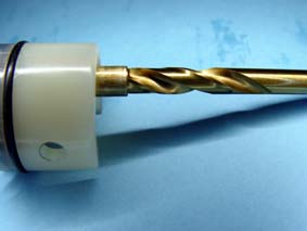Lネジ立てが終わったら、変形防止のため、六角穴付き止めネジをねじ込んだ上、全長の2/3ほど張り出した状態で、電動ドリルのチャックにくわえます。樹脂製ローラの端面は色々な形状がありますので、取り付けに適している面を外側にします。チャックの締め具合は、樹脂製ローラが変形しすぎないように加減します。傾いていないことを確認後、張り出した部分を、ヤスリを当てて細く削ります(8mm程度の範囲)。チャックから外れてしまった場合は、くわえ直して、必ず傾いていないことを確認してから、削り始めます。実際に使用するのシリンダーヘッドのパイプ部に、抵抗なく差し込めるようになるまで削ります。(パイプ内径よりわずかに小さく現物合わせM参照)材質が、比較的削りづらいので、目の粗いヤスリで削り始め、目の細かいヤスリや耐水ペーパーで仕上げましょう。 |