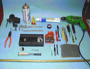 @『エアダンパーシステム』ピストンヘッドによる打撃音対策に使用するもの。前回追加工したシリンダーヘッド、VHSビデオテープの合成樹脂製ローラ、M3用タップ、タップハンドル、ドリルφ2.0からφ2.4、φ4.8他、ピンバイス、さら小ネジM3X12(長さ12mm以上)、M3六角ナット、M3用平座金、六角穴付き止めネジM3X16(すりわり付きでも可)、六角レンチ呼び1.5、極細油性ペン、クラフトナイフ、万力、ペンチ等、ストロー等のパイプ状の素材、ソケットドライバ呼び5.5、外径15.5mm程度の柄のドライバ等(竹串のようなもので代用可)、メインスプリングスペーサ用の素材、電動ドリル、ノギス、ヤスリ(粗いものと細かいもの)、ネジのゆるみ止め剤または接着剤(ポリプロピレン対応)、瞬間接着剤、耐水ペーパー、シリコンオイル、スケール、その他にメカボックス分解工具、特殊(トルクス)ネジ用工具、ドライバー(+)、ドライバー(−)(ストッパーレール取り外し用)、ピンセット、また、グラインダーがあるとベター。 |