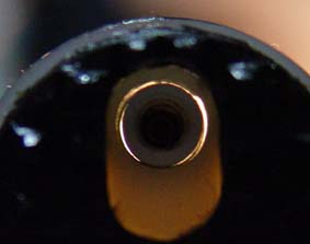 Bピストンヘッド固定用タッピンビスを外します。まず、ピストンヘッドの中央をドリルで穴あけします。内部に、タッピンビスの頭が見えるので、ビスのプラス溝に、ドライバーがキチンとかかるように、穴を広げます。ドリルで広げるのが良いでしょう。ドライバーをキチンとかけてピストンヘッドを外します。 さら小ネジと取り替えるため、穴を広げます。ドリルで広げて、クラフトナイフで仕上げるのが良いでしょう。シリンダーヘッドの緩衝材を痛めないように、穴の角を面取りしておきます。 |
