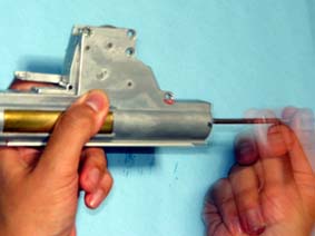 ピストンが、組み立て終わったら、再びメカボックスに仮組みし、動作の確認をします。うまく製作できていれば、Oリング、メインスプリング無しのピストン単体で組み込んだ状態で、メカボックスを振ると、ピストンが抵抗無くフルストロークします。続いて、Oリングを取り付け、ドライバ等を差し込んだ状態で仮組みします。今回、パワーが落ちることが予想されるので、Oリング周りは、シリコンオイルによる潤滑としました。ピストンをストロークさせて見ましょう。手ですばやく前進させたとき、前進端近くで、わずかに圧縮抵抗を感じる程度が効果的です。『こんなに弱くて効くの?』というレベルです。実際には、非常に短時間の動作なので、弱くて良いのだと考えます。エアを圧縮していることを実感できるような状態では、ピストン打撃音は減少しますが、ラック打撃音の増加などにより、作動音全体としてあまり静かになりません。また、シリンダーヘッドのパイプを塞いだ状態でもスムーズに後退できることが実感できます。 |