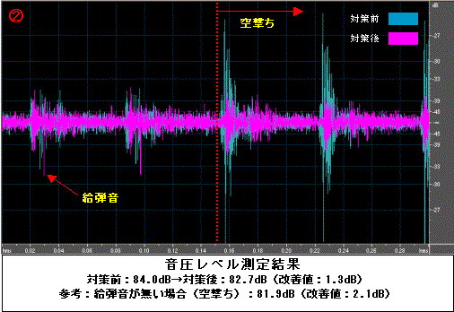 @対策前と対策後の動作波形。3発分を切り出して重ねて表示している。ピストン打撃音は、最大6dB(約5割)の軽減効果が認められる。また、ピストン打撃音の後の音も軽減されている。対策により、打撃音とともに打撃振動も減少しているため、各部干渉によって発生する音が軽減されているものと考える。音圧レベル測定結果は、作動毎の、各部干渉により生じるばらつきの他、特に給弾音の影響が大きい。(弾丸発射時に、鋭いピークが存在する。空撃ち時に存在しないことから、これは給弾音である。)今回は、比較的音の発生が少ないノーマルマガジンを使用しているが、作動音中で最大のピークとなっている。参考として、空撃ち状態では、ピストンの前進速度が速いにも関わらず、測定値は小さくなることから、影響の大きさがうかがえる。 A弾切れにより、空撃ちとなった状態の動作波形。ノーマルの打撃音のピーク差は10dB以上(3倍以上)に及ぶ。打撃音と衝撃は、ほぼ比例関係にあると考えられ、空撃ちが各部品に与える悪影響の大きさが想像できる。対策後は、弾丸の有無でほとんど変化がない。違いと言えば、給弾音が無いこと位だ。空撃ち状態におけるエアダンパーの、打撃音ピークの低減効果は、まさに劇的と言える! |
