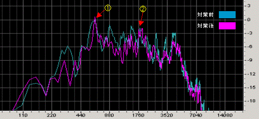 ■周波数特性測定結果約600Hzのピーク(@)はほとんど変化ないものの、これ以外の高域ピークは、2〜4dBの減少が見られる。基本的に突出している周波数成分が聞こえる音に強く影響することから、対策後では、音が明らかに低音域にシフトしたと言える。事実、聴感でも打撃音がソフトになった印象を受ける。なお、約1800Hzのピークにはほとんど変化が見られない。これは打撃音と関連しない音(給弾音等)と考える。(設定:FFTサイズ:2048、窓関数:Hanning。ピーク周波数(全周波数の中で最も大きな音圧レベル)より-20dB(10分の1)以下は無視できる為、切り捨ててある。) |